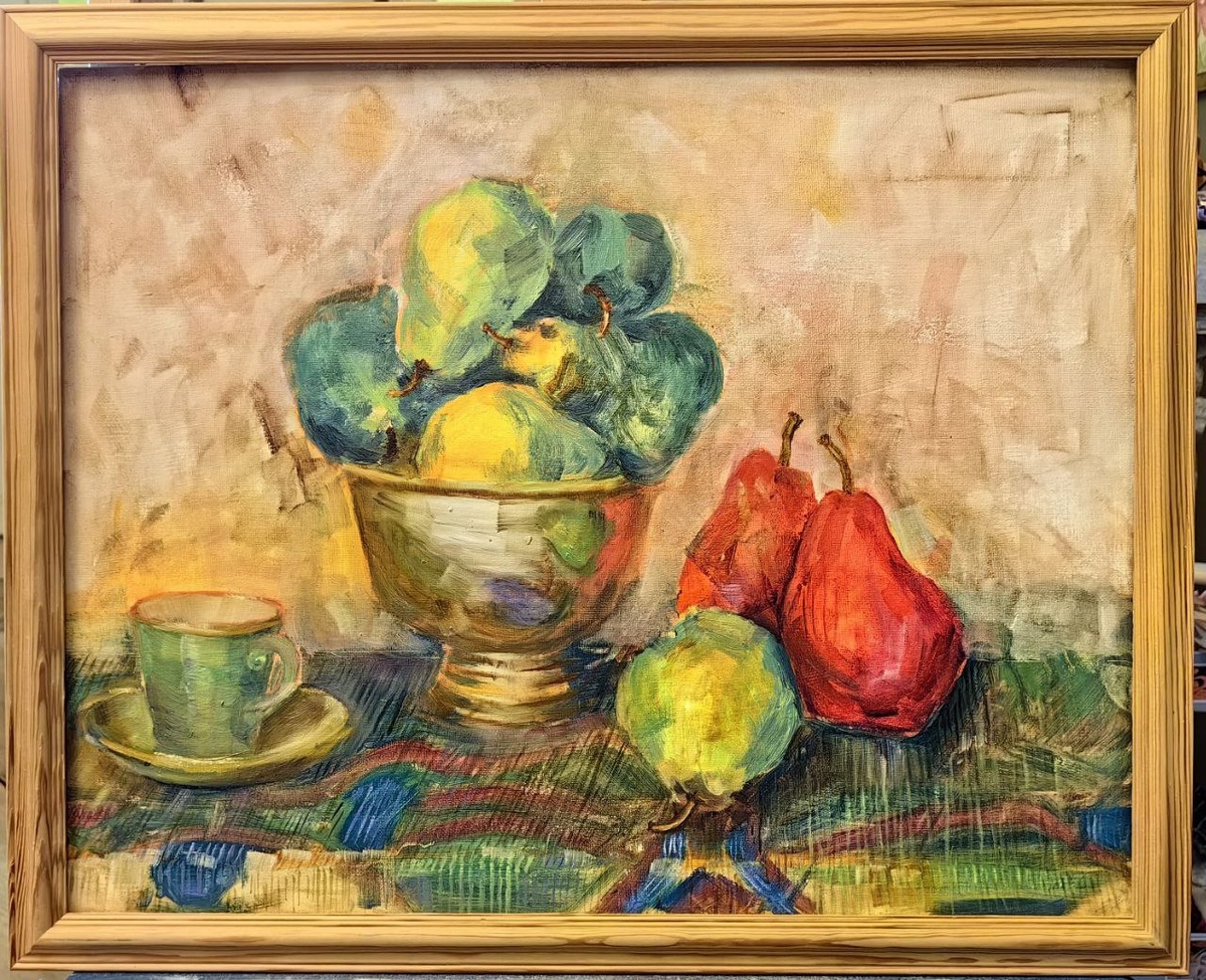 Закончила сегодня большую работу маслом - натюрморт в экспрессивной манере , размер 40/50 см, холст на картоне. Только сегодня писала 4 часа, первый раз ушло 1,5 часа на композию индийской желтой, она прямо сияет над чашкой. Фон над зелеными грушами написан умброй жжёной . Основная палитра : индийская жёлтая, ультрамарин, краплак красный в левой, красной груше, она имеет более теплый оттенок, и pink с ультрамарином в более холодной правой. Нашла в своем этюднике сегодня умбру натуральную и полоски на широкой части скатерти написаны ею. Зелёная майская и зелёная русская на зеленых грушах, потому что они уже были. Три часа второй сеанс и сегодня 4- ре часа прописывание линером полосок на скатерти, они разные в левой части и в правой . Переписывание блюдца и чашки, прописывание вазы, детализация груш и обобщение. #oilcanvas #oilpainting #живописьмаслом #paintingprocess #oilart #натюрмортмаслом #stilllifeoil