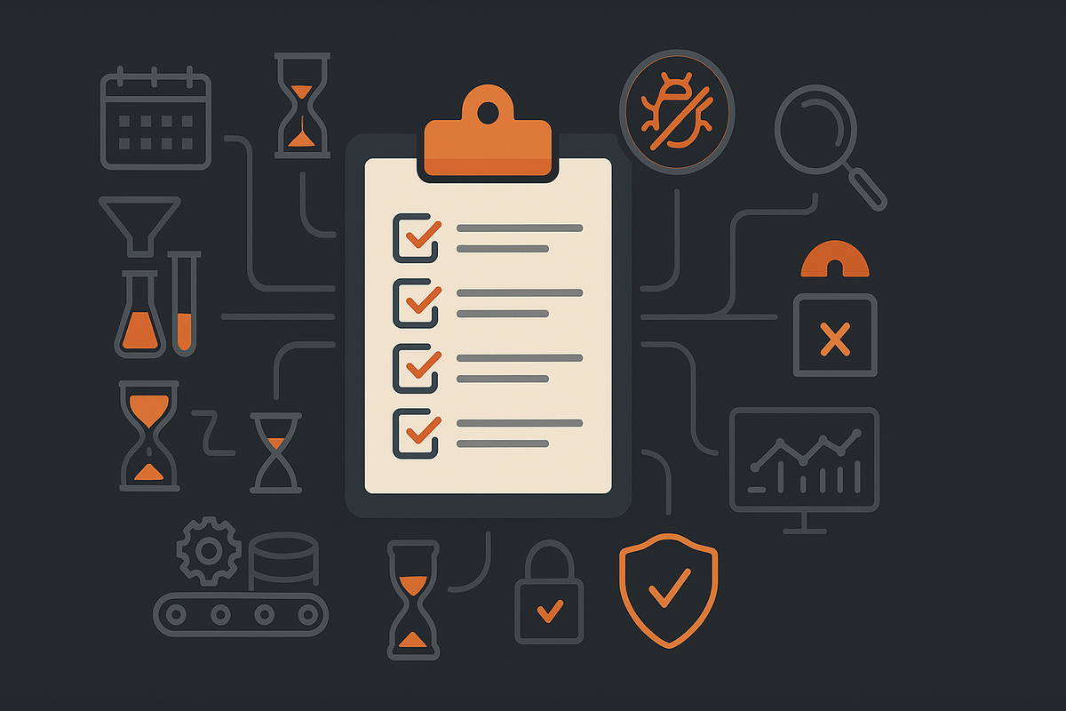 Метрики качества и прогресса. Что измеряем: покрытие ключевых сценариев, дефекты по критичности, «утечка дефектов» в прод, стабильность сборок, время до фикса, тренд перфоманса, доступность (SLO). Важно договориться не «о любой отчетности», а о той, что помогает принять решение.
