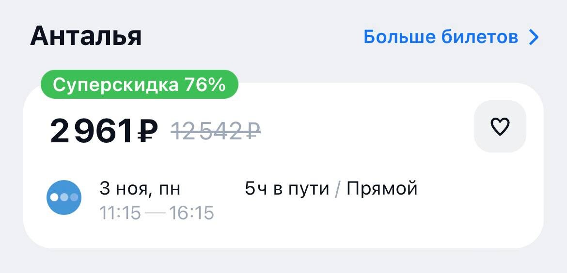 Билеты в Анталью подешевели до 3 тысяч рублей. Теперь можно улететь из Москвы в Анталью всего за 3 тысячи рублей. ────────── ⚡️Важные новости – без лишнего шума!⚡️ Подпишись на канал и получай только суть: оперативно, чётко, по делу! 👉 ИнфоСплетник | @infospletnik