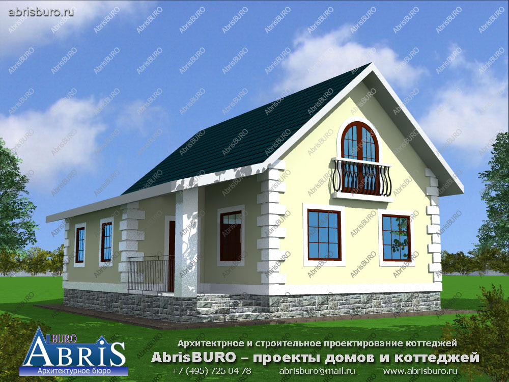 К097-93 Проект компактного мансардного коттеджа с крыльцом, французским балконом и единой кухней-гостиной-столовой общей площадью 93,6 квадратных метров и габаритными размерами 9,2 x 9,7 метров в архитектурном бюро AbrisBURO.