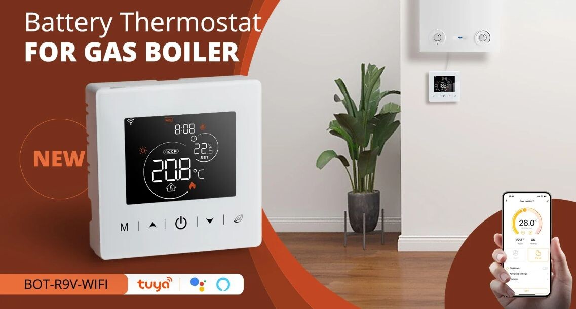 Простая бюджетная модель для управления котлом. Термостат с подключением к котлу по проводу. Выпускают в двух вариантах с wi-fi и zigbee подключением к сети. Модель Zigbee необходимо подключить к шлюзу Tuya, Питание батарейки. Для увеличения времени работы от батарей экран выключает подсветку через 3 секунды. Источник питания: 3 щелочные батарейки типа АА по 1,5 В.