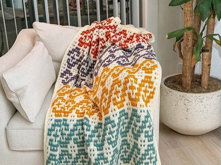 При вязании в этой технике получаются узоры, напоминающие мозаику (отсюда и название). В готовом изделии в каждом ряду чередуются два цвета, но в работе всегда один ряд вяжется одним цветом. В мозаичном вязании взят за основу тот же принцип, что и в ленивом жаккарде спицами (и иногда оно даже так и называется). В процессе работы используются только столбики с накидом и столбики без накида. Больше всего этой технике подходят простые (и не очень) геометрические узоры. Вязать можно поворотными рядами и по кругу, с обрезанием нити в каждом ряду и без. Полотно получается плотным и фактурным. Вяжут мозаичными узорами в основном что-то для украшения интерьера - пледы, чехлы на подушки, салфетки, ковры, а также сумки и рюкзаки. Но можно использовать их и для одежды. Пряжа Пряжу можно выбирать в принципе любую (кроме пушистой, так как рисунок получится размытым), но нити обоих цветов должны быть одинаковыми по составу и толщине. И самое главное обязательно нужно проверить перед работой, чтобы о