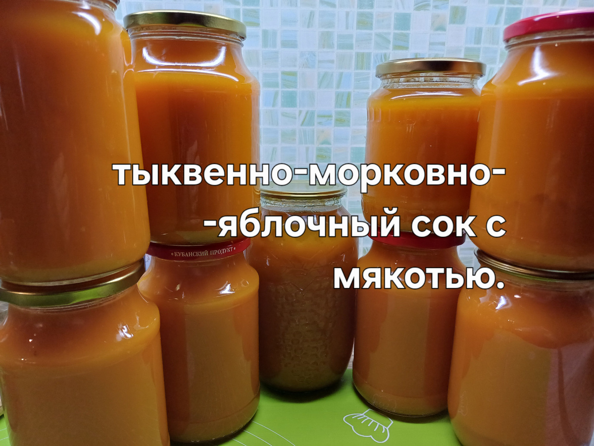 Рецепт; Тыква 3кг, Яблоки 2кг, Морковь 2кг, Сахар 600гр, Лимон 1шт, Лимонной кислоты 1ч.ложка. Овощи моем и режим на кусочки. Наливаем 2 литра воды. Ставим на огонь. Добавляем сахар. Измельчаем лимон. Добавляем к овощам. Варим овощи до мягкого состояния. Погружным блендером все овощи пюрируем. Делим на 2 части. В каждую добавила по 2 литра воды. И ещё по 300гр. Сахара. После добавила лимонной кислоту. Доводим до кипения. Кипит 5 минут и в стерилизованные банки. Укутать до остывания. Приятного аппетита!! Готовьте вкусную и полезную еду.