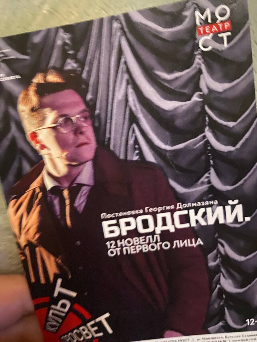 Бродский. 12 новелл от первого лица Театр МОСТ Постановка Георгия Долмазяна 1 час без антракта Образ Иосифа Бродского у каждого свой, но, наверное, чаще в памяти возникает немолодой седеющий уже человек, который в своей манере читает свои стихи. Тем удивительнее, что сегодня на сцене Бродским был совсем молодой актер Иван Орехов, с мальчишеским лицом, и это совершенно не помешало увидеть в нем того самого поэта. Никакого грима, парика, только плащ, шарфик, стопка книг да чуть нервная жестикуляция, но не было сомнений, кто перед тобой начинает лекции про Ахматову, Цветаеву и Достоевского, вспоминает о жизни в родительском доме, о столкновении с системой, читает стихи, в конце концов. Прекрасная работа, мои комплименты. Иван еще и автор инсценировки, к слову, очень удачной, на мой взгляд. Хотя в названии спектакля и фигурируют 12 новелл, я совершенно не восприняла это сборником рассказов. Напротив, это очень цельная, камерная и теплая история. Да, тут коротко, но ёмко знакомят нас с тем