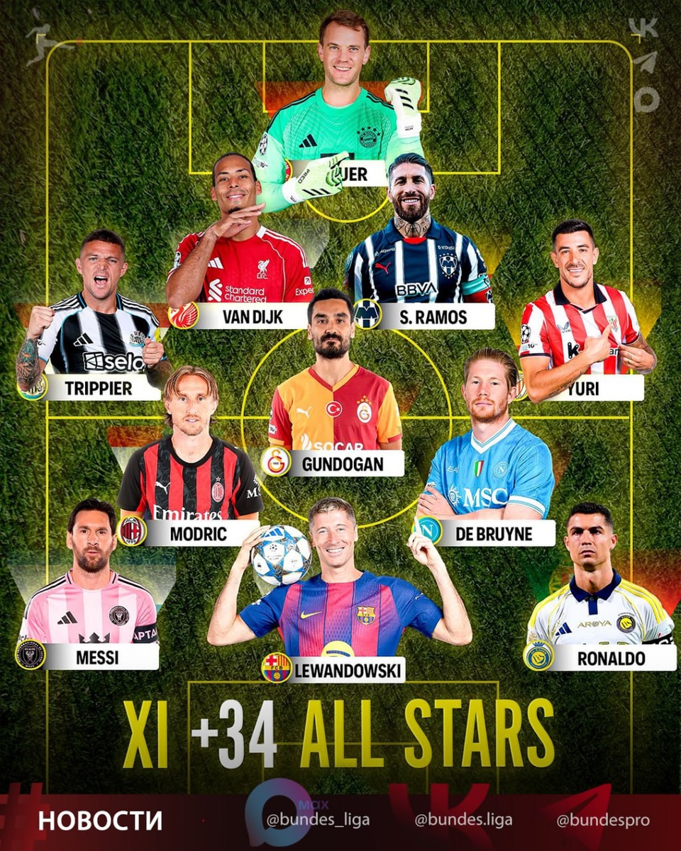 Время идёт, а опытные звёзды - всё ещё играют 🤘⚽️ 🇩🇪 Нойер 🧤 🏴 Триппьер 🇳🇱 Ван Дейк 🇪🇸 Рамос 🇪🇸 Берчиче 🇩🇪 Гюндоган 🇭🇷 Модрич 🇧🇪 Де Брюйне 🇦🇷 Месси 🇵🇱 Левандовский 🇵🇹 Роналду Как Вам такая Сборная 34+ ? 😊 ⭐️ MAX /// Видео+ ❤ Телеграм /// Аналитика+ ✅️ Флагманская /// Новости+