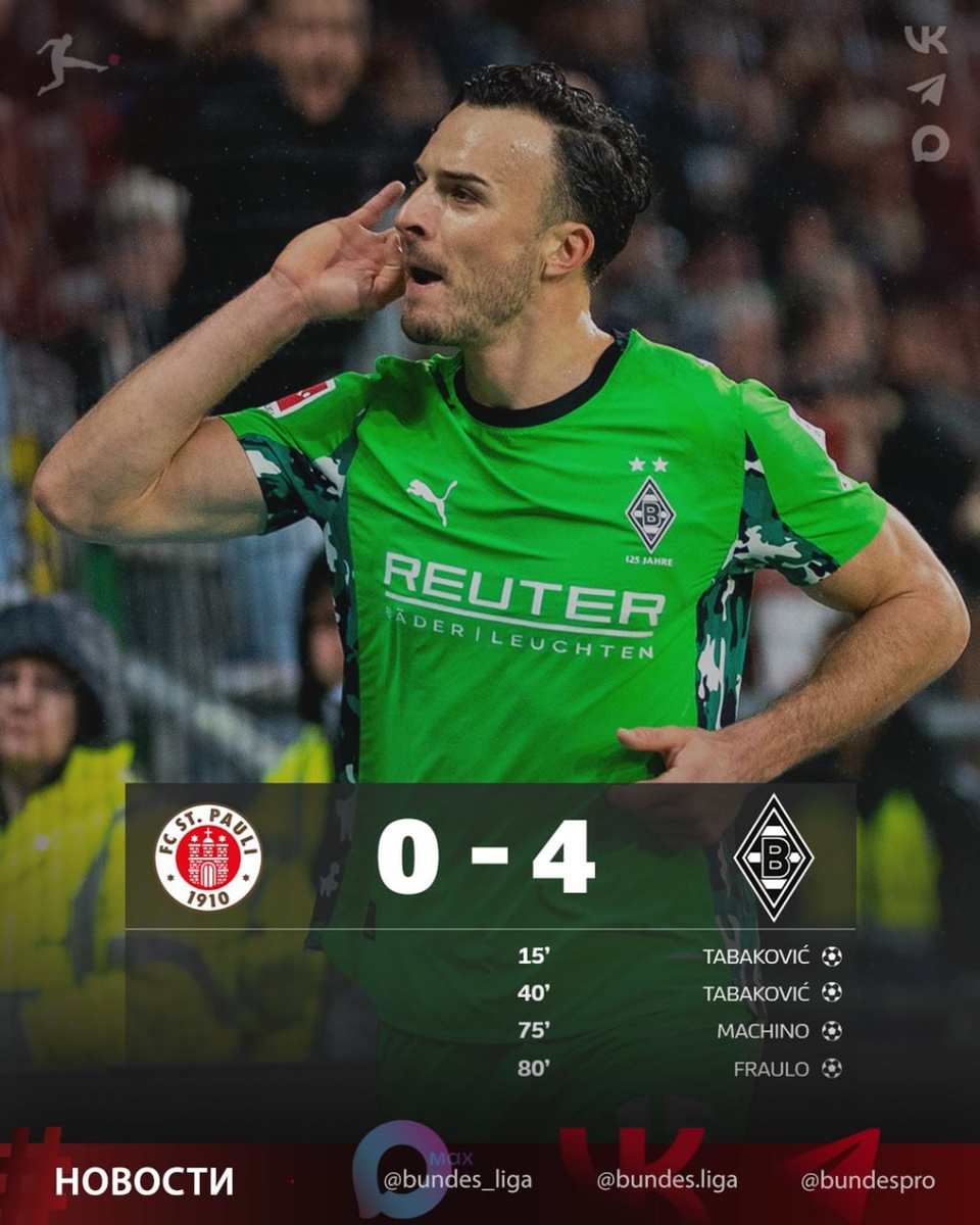 #Бундеслига ⚽️ 9 тур. «Гладбах» прорвало! 🔥🔥🔥 ✅ «Санкт-Паули» - «Боруссия М» 0:4 ⚽️ 15' Харис Табакович (0:1) ⚽️ 40' Харис Табакович (0:2) ⚽️ 75' Суто Матино (0:1) ⚽️ 80' Оскар Фрауло (0:1) ⚡️Футболисты из Мёнхенгладбаха ушли с последней строчки и впервые победили в Чемпионате Германии в новом сезоне. Боруссия набирает 6 очко в Бундеслиге и следующий матч проведёт дома с Кёльном. У «Санкт-Паули» шестое поражение ПОДРЯД и всего 7 очков в активе после 9 матчей 😟 ⭐️ MAX /// Видео+ ❤ Телеграм /// Аналитика+ ✅️ Флагманская /// Новости+