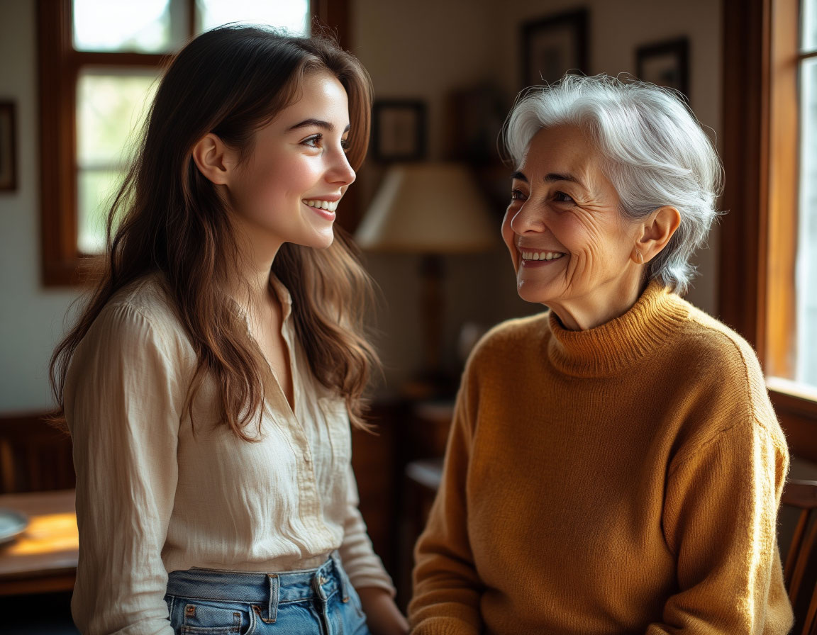 Рядом сидит внучка, держащая в руках старую фотографию бабушки и дедушки. Со слезами умиления смотрит она на снимок и шепчет тихо: «Вот бабушка и дедушка, какие они красивые были молодые!» Эти мгновения запечатлены навечно, став частью семейной истории, передаваемой из поколения в поколение.