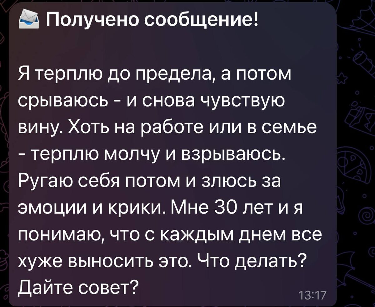 Здравствуйте! Я понимаю, насколько тяжело вам приходится. Ситуация, когда вы долго терпите, а затем срываетесь, с последующим чувством вины и самокритикой, изматывает, и кажется, что этому нет конца. Давайте посмотрим вместе, что происходит? Ваши эмоции, даже негативные, дают вам важную информацию. Злость, например, часто сигнализирует о нарушении ваших границ или обесценивании вашего труда. Особенно часто это происходит в семье, особенно - если есть маленькие дети. В такие моменты очень важно помнить: Вы – не ваши эмоции. Вы – человек, который испытывает эти эмоции. Когда вы чувствуете, что начинаете терпеть и пропускать в свои границы нежелательное, остановитесь на мгновение и спросите себя: "Что я сейчас чувствую? Злость? Обиду? Разочарование?". Затем попробуйте не осуждать эти чувства, просто наблюдайте за ними. Постарайтесь отследить, какие именно ситуации, слова или действия запускают ваше желание терпеть. Когда вы терпите, какие мысли проносятся в вашей голове? Часто это что-т