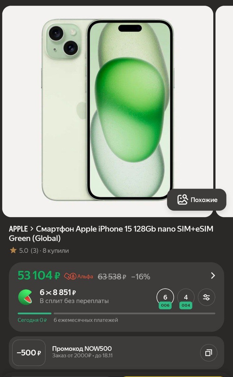 Смартфон Apple iPhone 15 128Gb nano SIM+eSIM Green (Global)