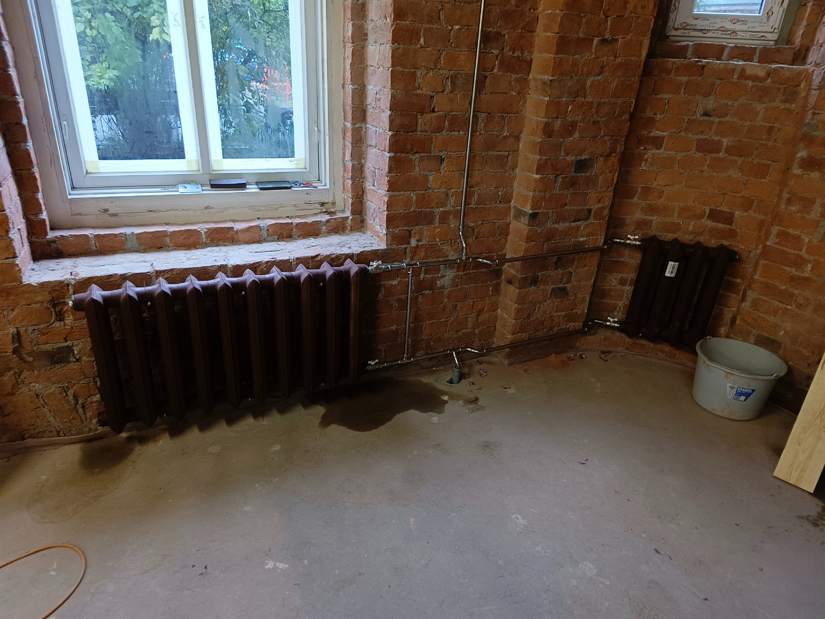 Вот такая была выполнена работа по монтажу чугунных радиаторов, 6 штук, с обвязкой нержавеющей трубой пресс фитингами и подключением к существующему стояку отопления под потолком из металлопластика, три стояка,соединение с металлопластиком тоже персс обжим, в подвале розлив из металлопластика, к нему и подсоединились. В следующей статье опобликую фото замены розлива в подвале. Отопление