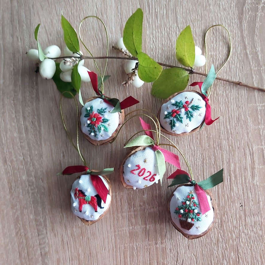 Вам понравились елочные игрушки (или игольницы) от австралийского дизайнера Джейн Николас? Мне тоже! Настолько, что я сделала свои елочные игрушки, вдохновившись идеей со скорлупками от Джейн Николас. Я сразу пошла на ближайший рынок, купила грецкие орехи, дома аккуратно отделила скорлупки орехов. С дизайнами все оказалось очень просто. Сюжеты для елочных игрушек довольно стандартные, здесь трудно сделать что-то необычное, как правило, это символ наступающего года (в этот раз лошадка красного цвета), елочка, веточка остролиста, пуансеттия... Дизайны для игрушек очень маленькие - не более 3 х 3 см, по размеру скорлупок, цветовая палитра традиционная для нового года - мулине зеленого. красного, коричневого, черного цвета, добавила немного белого бисера и снежинок вышитых металлизированным мулине золотого цвета. Эти дизайны может вышить даже вышивальщица с небольшим стажем вышивки, нужно знать совсем немного швов и техник: простая гладь, стебельчатый шов, шов "в раскол", французский узе