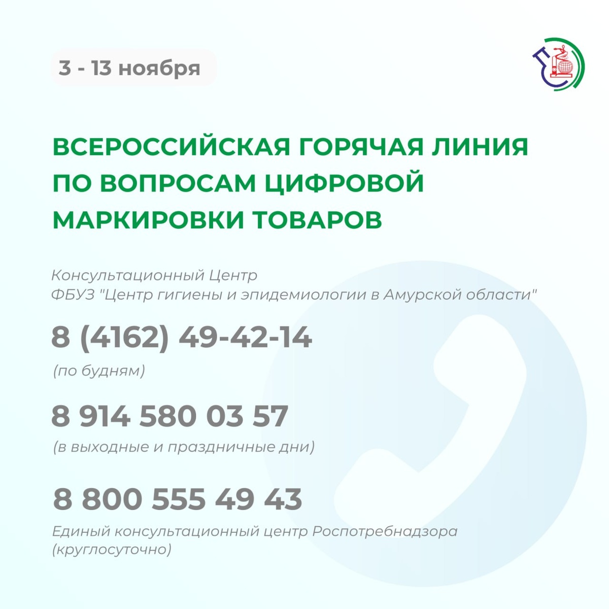 ☎️Открыта Всероссийская горячая линия по вопросам цифровой маркировки товаров С 3 по 13 ноября специалисты ответят на вопросы амурчан, касающиеся требований к обязательной цифровой маркировке продукции - какая продукция должна быть обязательно промаркированной? - куда обращаться, если обнаружен товар без маркировки? - какие исключения действуют? Горячая линия приурочена ко Всемирному дню качества, который отмечается 13 ноября Обратиться к специалистам можно по телефонам: 🟦Единый консультационный центр Роспотребнадзора 88005554943 🟦Управление Роспотребнадзора по Амурской области 8(4162)49-49-80 🟦Консультационный Центр ФБУЗ "Центр гигиены и эпидемиологии в Амурской области" 8(4162)49-42-14 (по будням) 89145800357 (по будням, в праздничные дни с 9:00 до 18:00) #защита_прав_потребителей 🔬 @cge_amur