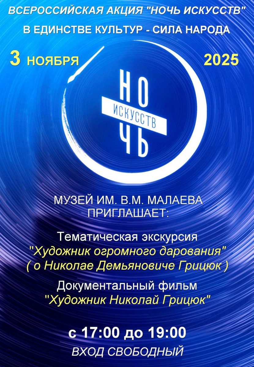 π Β«ΠΠΎΡΡ ΠΈΡΠΊΡΡΡΡΠ²Β» Π² ΠΌΡΠ·Π΅Π΅ ΠΈΠΌ. Π. Π. ΠΠ°Π»Π°Π΅Π²Π° 3 Π½ΠΎΡΠ±ΡΡ β Β«ΠΠΎΡΡ ΠΈΡΠΊΡΡΡΡΠ²Β». Π ΡΡΠΎΠΌ Π³ΠΎΠ΄Ρ Π°ΠΊΡΠΈΡ ΠΏΡΠΈΡΡΠΎΡΠ΅Π½Π° ΠΊΠΎ ΠΠ½Ρ Π½Π°ΡΠΎΠ΄Π½ΠΎΠ³ΠΎ Π΅Π΄ΠΈΠ½ΡΡΠ²Π° ΠΈ ΠΏΡΠΎΠΉΠ΄ΡΡ ΠΏΠΎΠ΄ Π΄Π΅Π²ΠΈΠ·ΠΎΠΌ Β«Π Π΅Π΄ΠΈΠ½ΡΡΠ²Π΅ ΠΊΡΠ»ΡΡΡΡ β ΡΠΈΠ»Π° Π½Π°ΡΠΎΠ΄Π°Β». ποΈ Π ΡΠ°ΠΉΠΎΠ½Π½ΠΎΠΌ ΠΌΡΠ·Π΅Π΅ ΠΈΠΌ. Π. Π. ΠΠ°Π»Π°Π΅Π²Π° Π²Π°Ρ ΠΆΠ΄ΡΡ ΡΠ΅ΠΌΠ°ΡΠΈΡΠ΅ΡΠΊΠ°Ρ ΡΠΊΡΠΊΡΡΡΠΈΡ Β«Π₯ΡΠ΄ΠΎΠΆΠ½ΠΈΠΊ ΠΎΠ³ΡΠΎΠΌΠ½ΠΎΠ³ΠΎ Π΄Π°ΡΠΎΠ²Π°Π½ΠΈΡΒ». ΠΠ½Π° ΠΏΠΎΡΠ²ΡΡΠ΅Π½Π° ΠΠΈΠΊΠΎΠ»Π°Ρ ΠΠ΅ΠΌΡΡΠ½ΠΎΠ²ΠΈΡΡ ΠΡΠΈΡΡΠΊΡ β Π·Π½Π°ΠΌΠ΅Π½ΠΈΡΠΎΠΌΡ Π·Π΅ΠΌΠ»ΡΠΊΡ, ΡΡΠ°ΡΡΠ½ΠΈΠΊΡ ΠΠ΅Π»ΠΈΠΊΠΎΠΉ ΠΡΠ΅ΡΠ΅ΡΡΠ²Π΅Π½Π½ΠΎΠΉ Π²ΠΎΠΉΠ½Ρ ΠΈ Ρ