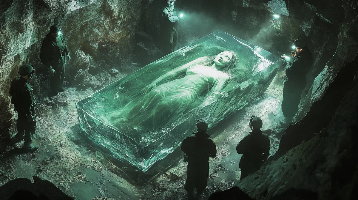 Внутри лежала женщина — молодая, красивая, будто спящая. Кожа — белая, лицо — словно живое. На ней — простое белое платье, которое выглядело совсем не древним. А тело покоилось в прозрачной розоватой жидкости, будто в каком-то фантастическом консерванте.