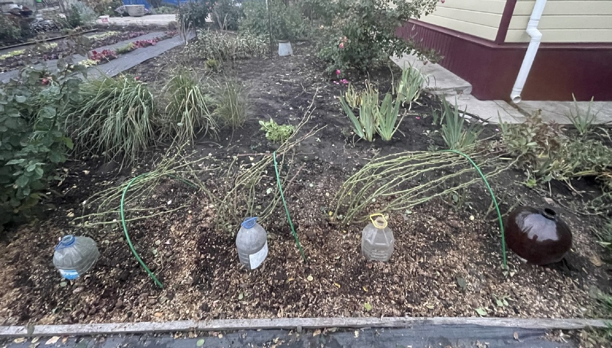 3.11.2025. Понедельник. Время рубрики «Спроси у автора» Вопрос был задан по фотографии. А что у вас под пятилитровыми баклажками? Сразу ответила на комментарий. Последовало еще несколько вопросов: Собственнокоренные? Когда сажали? Уйдут в зиму под баклажками? Срочно пишите нам статью!)) Иногда ставлю на укоренение черенки роз. Слово «иногда» здесь ключевое. На все надо время. И если кто-то говорит, что само укореняется, растет, то лукавит немного. Если находишься всегда на своих сотках, при растениях и тех же черенках, то это совсем не то, когда ты садовод выходного дня. Это аналогично ситуации с женскими делами по дому. Они становятся заметными, когда женщина перестает их выполнять. Без фанатизма, то есть без особых надежд на результат, делаю черенки роз и ставлю их на укоренение. Первый раз делаю это при обрезке после первой волны цветения. Фотографий черенков нет. Но тут все стандартно. Для черенка беру побеги толщиной приблизительно с карандаш. Черенок - это часть побега с двумя