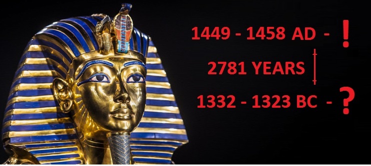 И тогда получается, что одна из династий должна начаться от года 4241до н.э., а вторая от 2781до н.э. Тогда годы правления самого Тутанхамона, чье имя египтологами читается как Неб Хепру Ра, которые согласно ТИ считаются 1332-1323 до н.э., получаются как 1449-1458 от начала правления второй династии. Что позволяет без труда построить вероятный оригинал (ВО) его правления на XV век, на годы 1449-1458. И посчитать разность между вероятным оригиналом и образом: 1449 + 1332 = 2781.