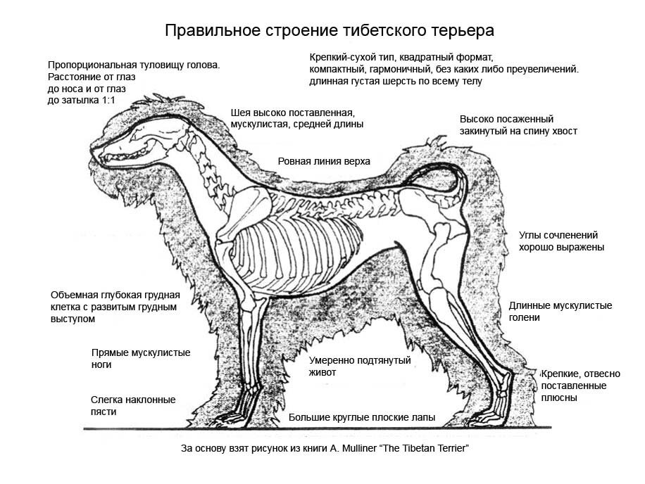 Особая благодарность Angela Mulliner за её исследование скелета тибетского терьера, опубликованное с разрешения из её книги «Тибетский терьер», вышедшей в Англии в 1977 году и переизданной в 1991 году (том 1).