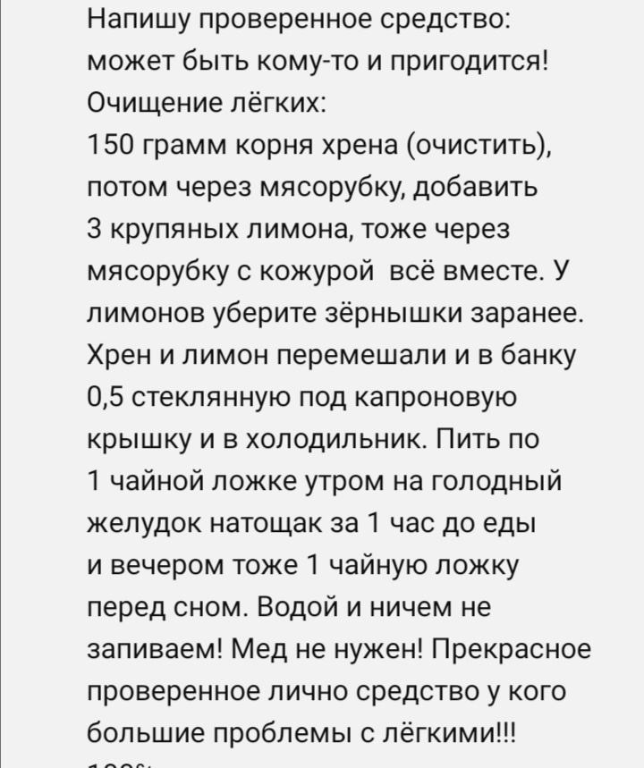 У меня на канале уже есть рецепт, который прекрасно чистит и лечит весь организм .Это чудесная настойка на лимоне и чесноке, которая прекрасно помогла мне в лечении моих болезней . Нашла ещё один интересный рецепт , который обязательно поможет вылечить легкие. Рецепт включает в свой состав лимон и корень хрена. Уверена в чудодейственнном свойстве этого средства в . Всем здоровья и удачи ! Ссылка на рецепт приготовления эликсира из лимона и чеснока