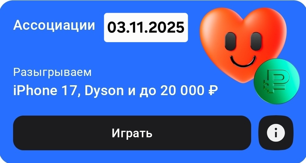 Продолжаем наш ноябрьский марафон в "Ассоциациях"! Месяц только начался, а значит у нас с вами есть отличная возможность накопить максимум звёзд для участия в розыгрышах. Напомню, что в этом месяце целых 5 призовых категорий — от 500 рублей до iPhone 17. Лично я уже активно собираю звёзды на AirPods Max — как раз к Новому году такой подарок будет очень кстати! 🎄 1. Река + Поток + Вода → ТЕЧЕНИЕ 🌊 2. Самолет + Корабль + Проводник → БОРТ ✈️ 3. Карта + Пень + Пасьянс → КОЛОДА 🃏 1. Раскладка + Азбука + Букварь → АЛФАВИТ 🔤 1. Недоумение + Разногласие + Неясность → НЕПОНИМАНИЕ 🤔 2. Дача + Город + Село → ПОСЕЛОК 🏡 3. Голубь + Покой + Гармония → МИР 🕊️ 1. Бренд + Стиль + Тенденция → ТРЕНД 👗 2. Радушие + Рация + Осмотр → ПРИЁМ 📻 3. Пестик + Пыльца + Размножение → ТЫЧИНКА 🌸 4. Откос + Подставка + Цветок → ПОДОКОННИК 🪴 5. Цвет + Растение + Трава → ЗЕЛЕНЬ 🌿 · 500 рублей — всего 10 звёзд за билет · 20 000 рублей — 15 звёзд за билет (в 2 раза дешевле, чем в октябре!) · iPhone 17 — 85 зв