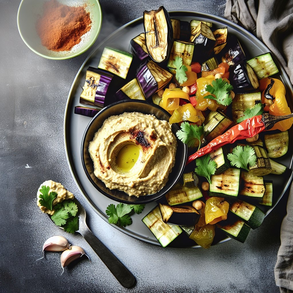 Хумус с печёными овощами Полезный перекус или лёгкий ужин: приготовьте хумус из нута с печёными баклажанами, перцем и цукини. ⠀ Для хумуса: замочите 200 г нута на ночь, затем отварите до мягкости. Взбейте в блендере нут, 2 ст.л. тахини, 1 зубчик чеснока, 2 ст.л. сока лимона, 2 ст.л. оливкового масла, щепотку паприки, перец и соль по вкусу. ⠀ Для овощей: нарежьте баклажан, цукини и сладкий перец кубиками, сбрызните маслом и запеките при 180°С 25 минут. Подавайте овощи с хумусом и свежей кинзой. ⠀ Калорийность: 142 ккал на 100 г. Общий вес: 800 г. ⠀ Будь настойчив — правильное питание сделает твои результаты ещё круче! ✌️