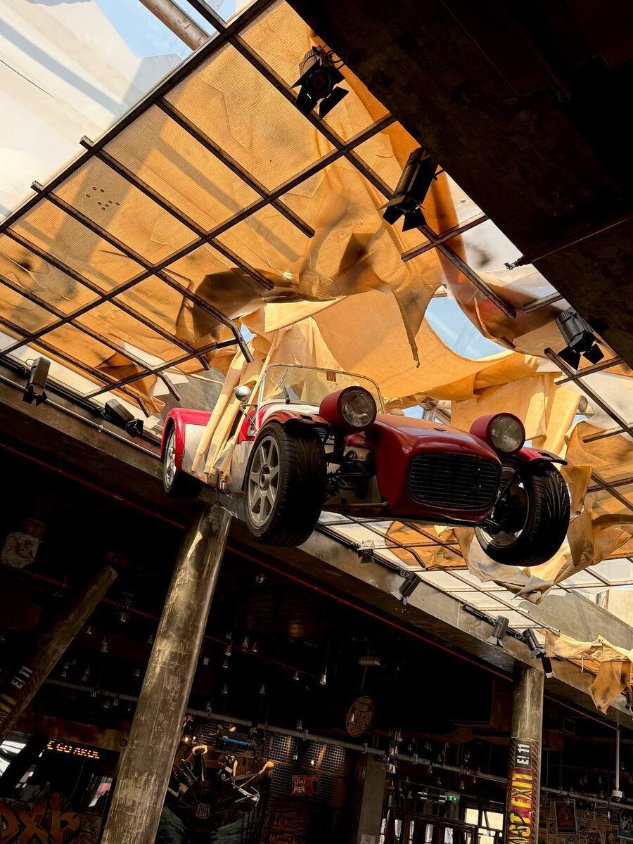 Поймала вот такое место, залипла и делюсь. Заправка-не-заправка, кафе-не-кафе. Машина под потолком, рваный текстиль вместо декора, бетон, металл, постеры. Все помнят Безумного Макса? Люблю такие пространства, узнаваемые. Можно не захотеть остаться здесь надолго, но мозг сделает скриншот. Paul Rand "Make it simple, memorable, make it inviting to look at”