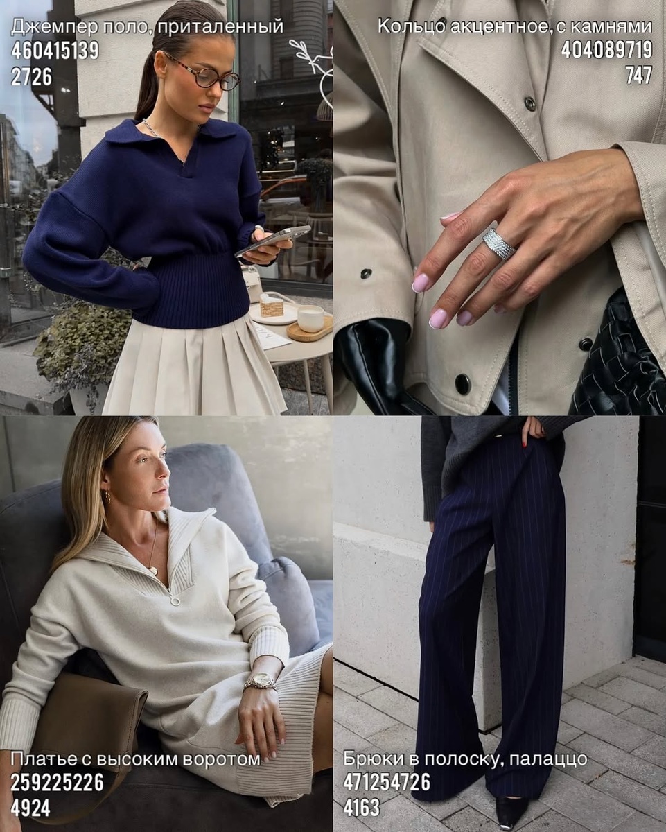 В этой подборке — спокойные, интеллигентные вещи, которые складываются в гибкую капсулу для офиса, прогулок и тёплых встреч. Палитра — сливки, дымчатый серый, глубокий синий и блеск холодного металла.