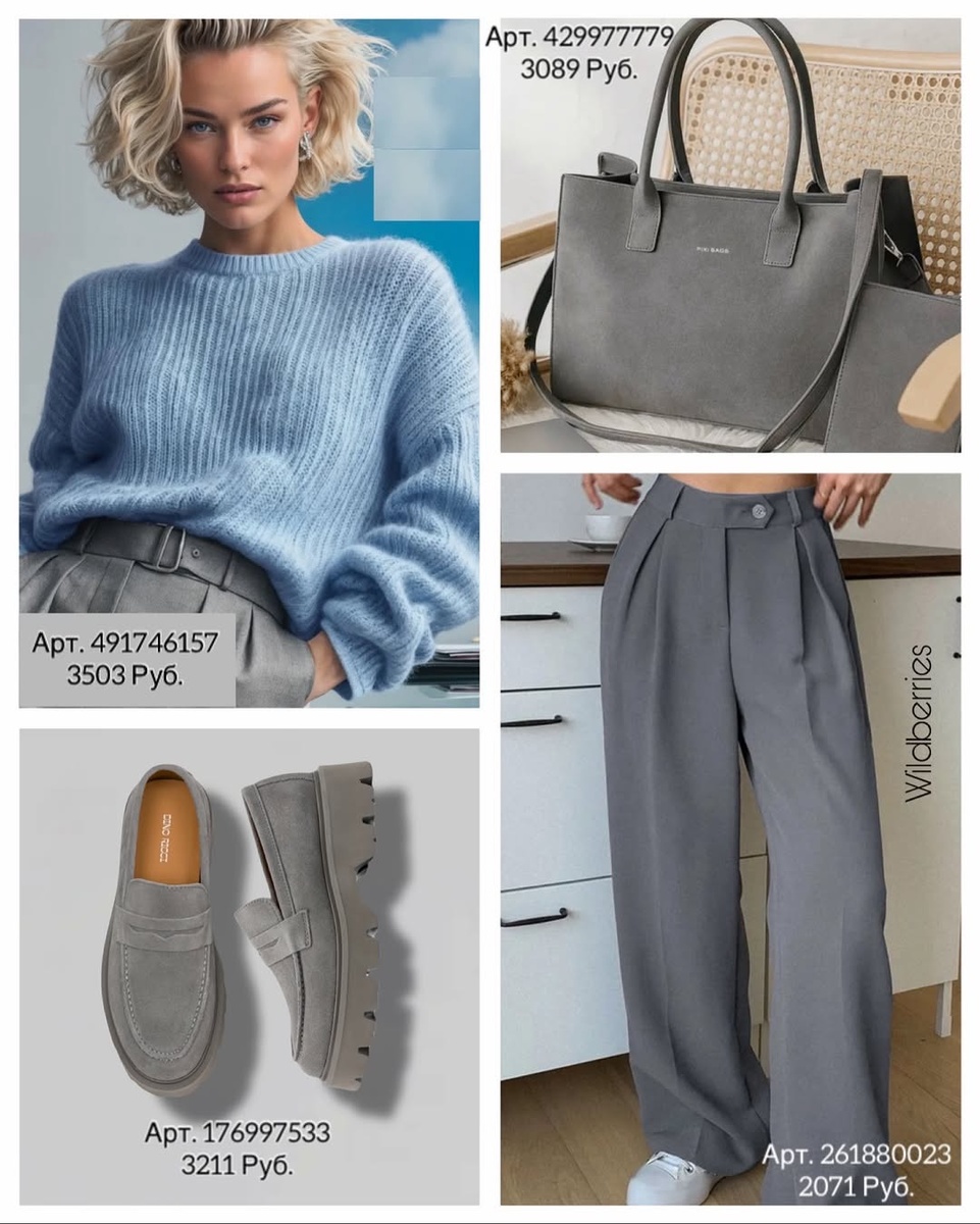 - Холодный день в городе: свитер небесный (1) + серые брюки (4) + лоферы (3) + структурная сумка (2).