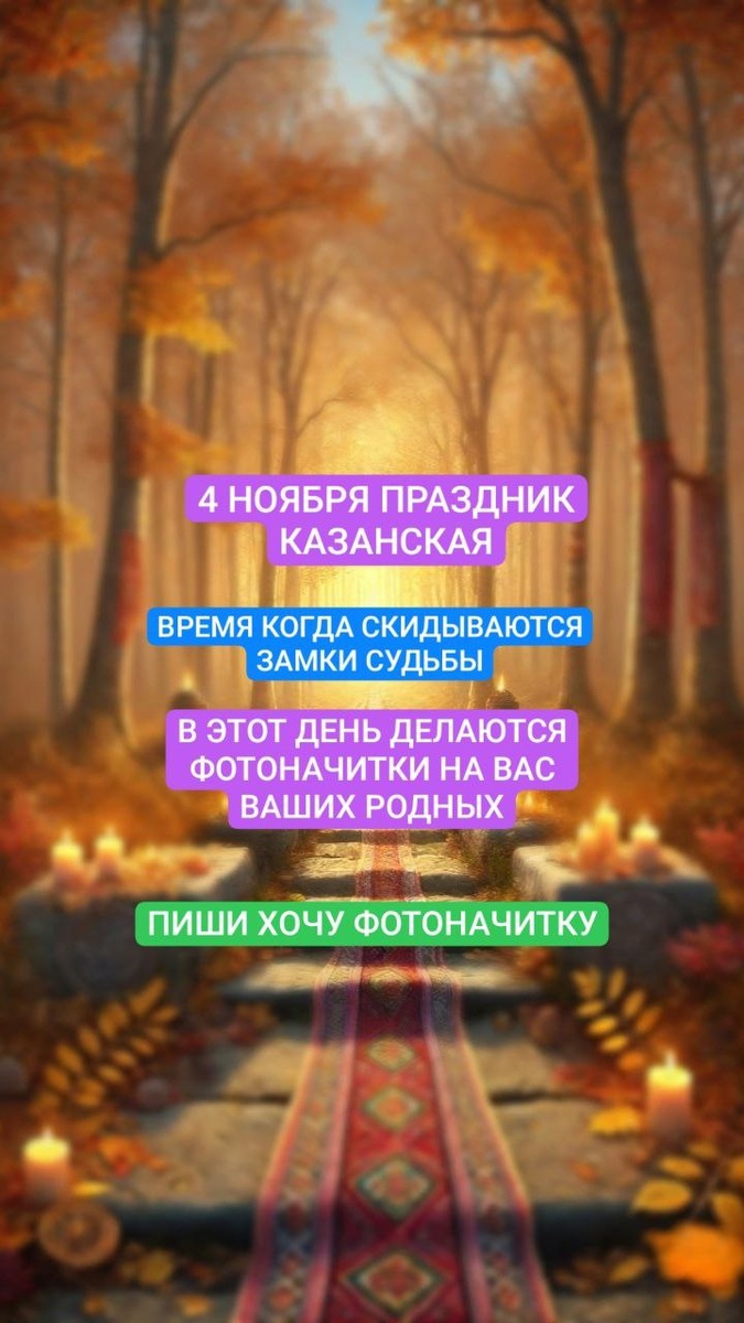 "Казанская" 4 ноября и продолжается приём фотографий на фотоначитку в праздник "Казанская" (4 ноября). Существует поверье, что в древности на Казанскую предки проводили тайные обряды «снятия замков с судьбы». В такие мощные дни важно быть в потоке защитной силы. Поэтому я, Ольга Щепоток — Леди Шепоток, провожу фотоначитки - обереги на ваши фотографии, усиливая защиту и благополучие. Ниже можете выбрать тему фотоначитки или запросить свою тему: 1. Щит рода и дома – защита от зла, укрепление стен и корней 2. Соединение судеб – фотоначитка на привлечение суженого, пробуждение любви 3. Очищение духа – освобождение от чужеродного от чуждых привычек (от пьянства, курения, от переедания) 4. Изобилие и достаток – открытие пути к богатству, привлечению благ 5. Отвод порчи и сглаза – очищение от негативного влияния, возврат утраченной силы Каждая тема усиливает энергетику дня и укрепляет вселенскую защиту Стоимость за одну тему — 399₽. После оплаты отправлю инструкцию - обряд о том,