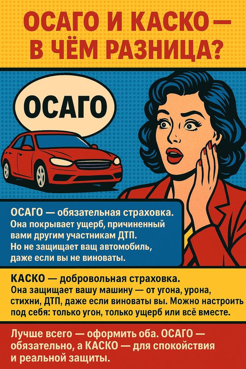 🚗 ОСАГО и КАСКО — в чём разница? Многие путаются, в чём отличие между этими двумя полисами. Разбираем коротко и понятно: 🔹 ОСАГО — обязательная страховка. Она покрывает ущерб, причинённый вами другим участникам ДТП. Но не защищает ваш автомобиль, даже если вы не виноваты. 🔸 КАСКО — добровольная страховка. Она защищает вашу машину — от угона, урона, стихии, ДТП, даже если виноваты вы. Можно настроить под себя: только угон, только ущерб или всё вместе. ✅ Лучше всего — оформить оба. ОСАГО — обязательно, а КАСКО — для спокойствия и реальной защиты. 📲 Хочешь рассчитать стоимость или оформить полис? Пиши — помогу подобрать лучший вариант из надёжных компаний. 📞 8 911 201 92 72 📩 Telegram: @vasilevaep 🌐 https://dzen.ru/id/677d132563b01e74f3e6f462 #страхованиеводнокасание #ОСАГО #КАСКО #страховойброкер #ВасильеваЕкатерина #автострахование