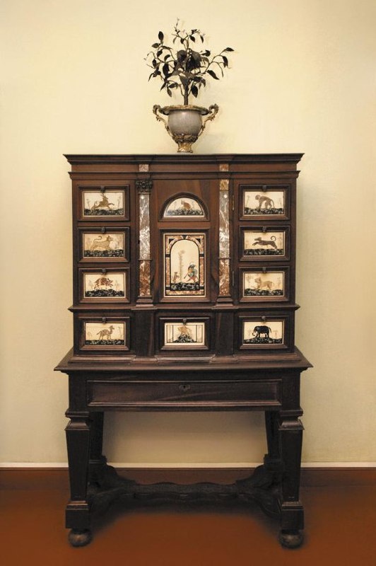 Первоначальный облик Кусково #ponedelnik_kuskovo "Шкап ореховый" в XVIII в. входил в обстановочный комплекс кусковского Итальянского домика. Кабинет декорирован в технике pietre dure — каменной или флорентийской мозаикой. Сюжеты вставок основаны на баснях Эзопа, что достаточно часто встречается в оформлении данного типа мебели. На каждом из ящиков кабинета представлены различные животные, например, кабан, олень, слон, обезьяна, верблюд, лев, собака. Традиционно центром композиции кабинетов с баснями Эзопа был сюжет "Орфей играющий животным" (последнее изображение). 🤣 Почему на "шкапе" фигуру прекрасного античного героя сменил горбун, играющий на флейте собаке? Такое преображение мифологического персонажа было обусловлено характерной для этого периода популярностью графической карикатуры. Одна из таких карикатур легла в основу изображения на кабинете. В альбоме «Varie figure gobbi» (Разные фигуры горбунов, около 1621 – 1625гг.), созданном Жаком Калло, есть два изображения горбуна