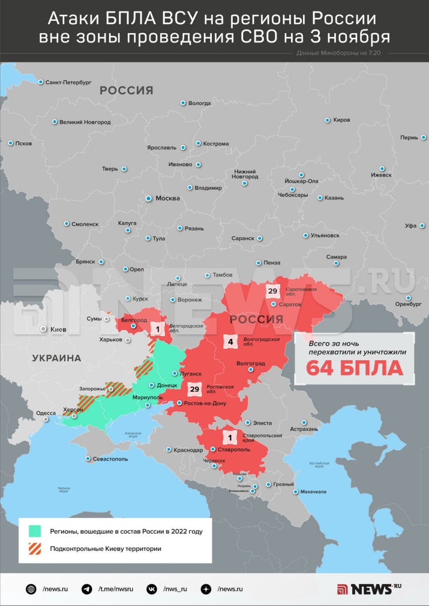 Силы ПВО сбили 64 украинских беспилотника над регионами России за ночь, сообщили в Минобороны. По 29 дронов уничтожено над территориями Ростовской и Саратовской областей. Также БПЛА перехватили над Волгоградской и Белгородской областями. Подробнее — на нашей инфографике. ⭕️Подписаться | Мы в MAX | Буст