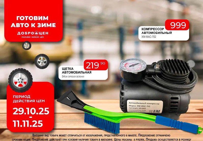 Зима близко — самое время подготовить автомобиль к холодному сезону! В Доброцене всё для комфортной и безопасной езды по выгодным ценам. 🔧 Автокомпрессор ХМ-МАС-702 — 999 ₽ 🧊 Антифриз EURASIA G12 Красный — 399 ₽ 🛢 Моторное масло EURASIA Полусинтетическое 10w40, 4л —839 ₽ 🧽 Щетка-скребок автомобильная 54 см —219,90 ₽ 🕒 ПЕРИОД ДЕЙСТВИЯ ЦЕН: с 29.10.25 по 11.11.25 📍 Адрес 🔥Доброцен — магазин низких цен Реклама. ООО "ПВ-Дальний Восток", ИНН: 6658540800
