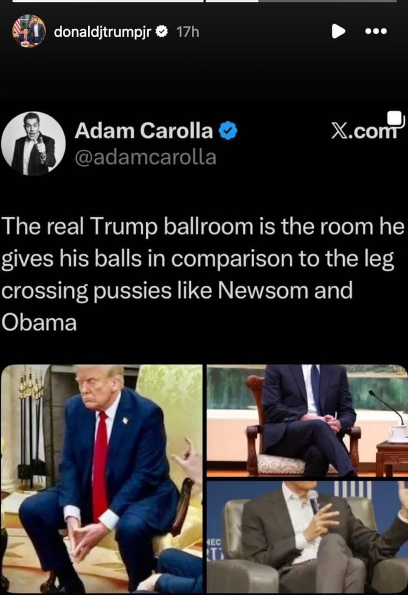 Jr compares Trump 'BALLS' to 'leg crossing PUS*Y Obama' 'The real ballroom'?