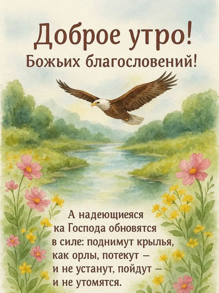 Доброе утро! Да благословит Господь начало этой трудовой недели и подаст мир сердцу, ясность уму и крепость на всякое доброе дело. Пусть Ангел Хранитель обережёт от суеты и уныния, а молитва укрепит в терпении и кротости. Желаем здравия душевного и телесного, добрых встреч, мудрых решений и благого плода трудов. Хорошей продуктивной недели! С Богом — и в радости о Нём