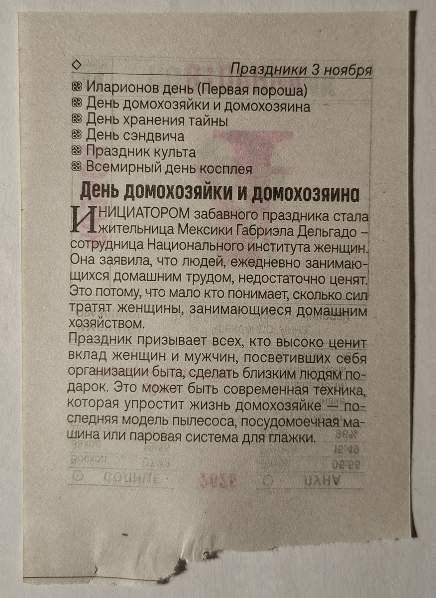 3 ноября, илларионов день, день первой пороши. А у нас плюс 5 и никакой пороши не намечается, даже маленькой порошки не загадывается сегодня. А еще, сегодня день домохозяйки, это ж мой день.. Как и день хранителя тайн. Ооо, у меня есть. У меня много тайн, больше чужих.