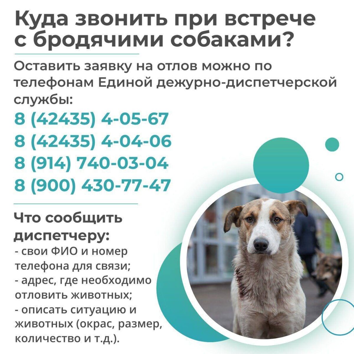 🐕На территории муниципального округа продолжается работа по регуляции численности безнадзорных животных. 🐩Жителей просят не подкармливать бродячих собак, чтобы исключить формирование агрессивных стай. ➡️Напомним, заявку на отлов можно оставить по телефонам ЕДДС: 8 (42435) 4-05-67, 4-04-06,8 (914)-740-03-04, 8 (900)-430-77-47. 👨💻Если вдруг ваша собака попала к отловщикам, посмотреть ее можно в ТГ каналах приютов "Братья Гав" (https://clck.ru/3FgHsX) и "Хвостик" (https://clck.ru/3FgHsY). 🦮Также обращаем внимание, что самовыгул животных в Корсакове запрещен. Собака должна быть на поводке, в наморднике и под присмотром владельца.