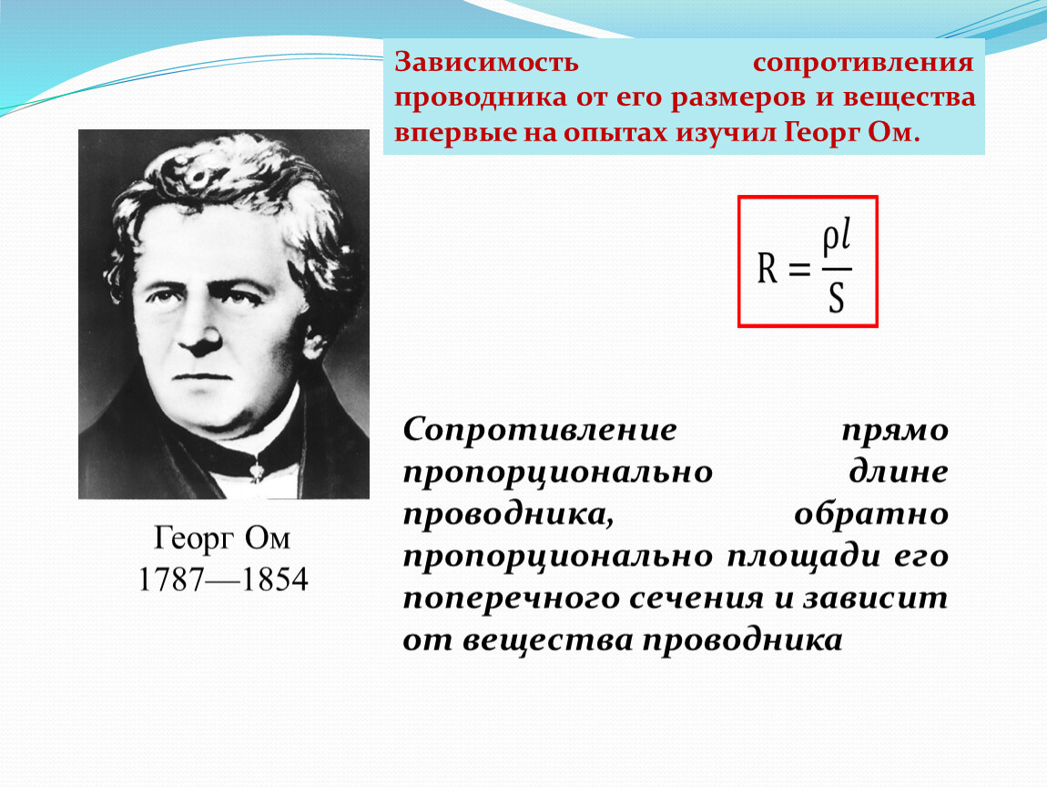 Электрическое сопротивление — физическая величина, характеризующая свойство проводника препятствовать прохождению электрического тока. Обозначается буквой R или r. Сопротивление возникает из-за взаимодействия электрического тока с материалом, через который он проходит. Например, в металлах электроны сталкиваются с атомами кристаллической решётки, из-за чего теряют часть своей энергии. В жидких проводниках и газах вместо электронов движутся заряженные частицы молекул, которые встречают сопротивление при своём движении. В Международной системе единиц (СИ) единица сопротивления — ом (Ом). 1 Ом — это сопротивление проводника, в котором при напряжении 1 В сила тока равна 1 А. Формула закона Ома для участка цепи: R = U / I, где: Сопротивление зависит от следующих факторов: Для измерения электрического сопротивления используют омметр — измерительный прибор непосредственного отсчёта. Обычно измерение производится по постоянному току, но в некоторых электронных омметрах возможно использование