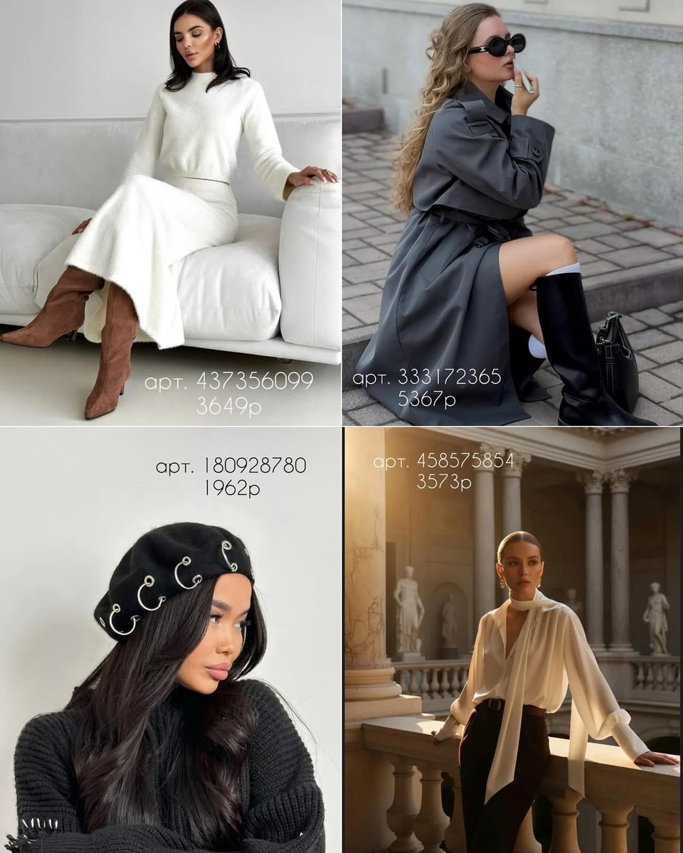 Эта подборка — о том, как создать впечатление effortlessly chic без усилий. Мягкие ткани, чистые линии, баланс между классикой и акцентами. Белоснежный костюм — для женственности, графитовый тренч — для уверенности, берет — для характера, блузка — для утончённости, а кожаная куртка и шоколадная сумка добавят силы и статуса.
