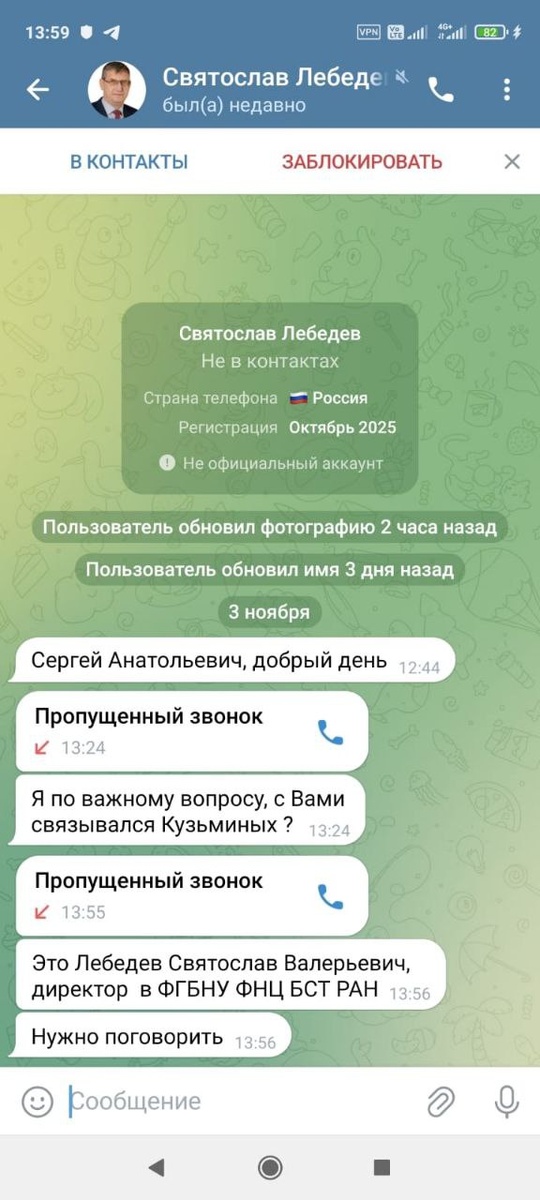 Добрый день! От имени директора, Лебедева Святослава Валерьевича поступают звонки и сообщения. Будьте внимательны, это мошенники!!!