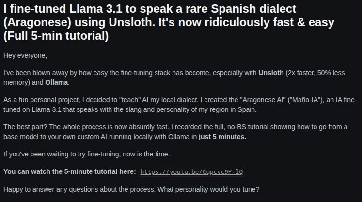 Π°ΠΊΠΎΠΌ - Π½Π°ΡΡΠΈΠ» Llama 3.1 Π³ΠΎΠ²ΠΎΡΠΈΡΡ Π½Π° ΡΠ΅Π΄ΠΊΠΎΠΌ Π°ΡΠ°Π³ΠΎΠ½ΡΠΊΠΎΠΌ Π΄ΠΈΠ°Π»Π΅ΠΊΡΠ΅! Π ΡΠ°ΠΌΠΎΠ΅ ΡΠ΄ΠΈΠ²ΠΈΡΠ΅Π»ΡΠ½ΠΎΠ΅ - Π²Π΅ΡΡ ΠΏΡΠΎΡΠ΅ΡΡ Π·Π°Π½ΡΠ» Π²ΡΠ΅Π³ΠΎ 5 ΠΌΠΈΠ½ΡΡ Ρ ΠΏΠΎΠΌΠΎΡΡΡ Unsloth ΠΈ Ollama. ΠΠ°ΡΠ΅Π½Ρ ΡΠΎΠ·Π΄Π°Π» "MaΓ±o-IA" - ΠΠ Ρ Ρ
