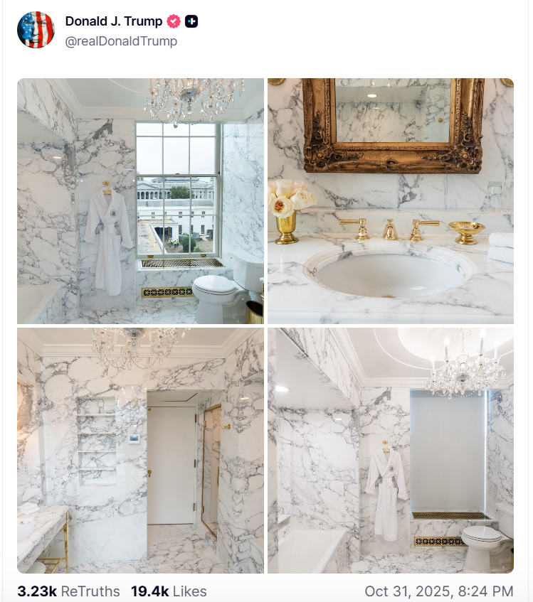 В мире высокой политики и дизайна интерьеров произошло событие тектонического масштаба. Была восстановлена историческая справедливость, и дух 16-го президента США Авраама Линкольна наконец-то может упокоиться с миром. Причиной многолетнего беспокойства, как следует из завирусившегося сообщения, была ванная комната в Белом доме, оформленная в 1940-х годах в стиле арт-деко. Представьте себе: простая, но элегантная эпоха Гражданской войны, и тут — "совершенно неуместная" зелёная плитка.Можно только догадываться, какие душевные муки испытывал призрак Честного Эйба, витая над этим пережитком эпохи Трумэна. Но нашелся человек, который не смог мириться с этим вопиющим анахронизмом. Дональд Трамп, как сообщается в его посте в социальной сети Truth Social, взял дело в свои руки. Решение было найдено — простое и элегантное, как и всё гениальное. Ванная была полностью отделана "чёрно-белым полированным мрамором Statuary". Как утверждается в сообщении, этот стиль "очень подходил для времени Авраам