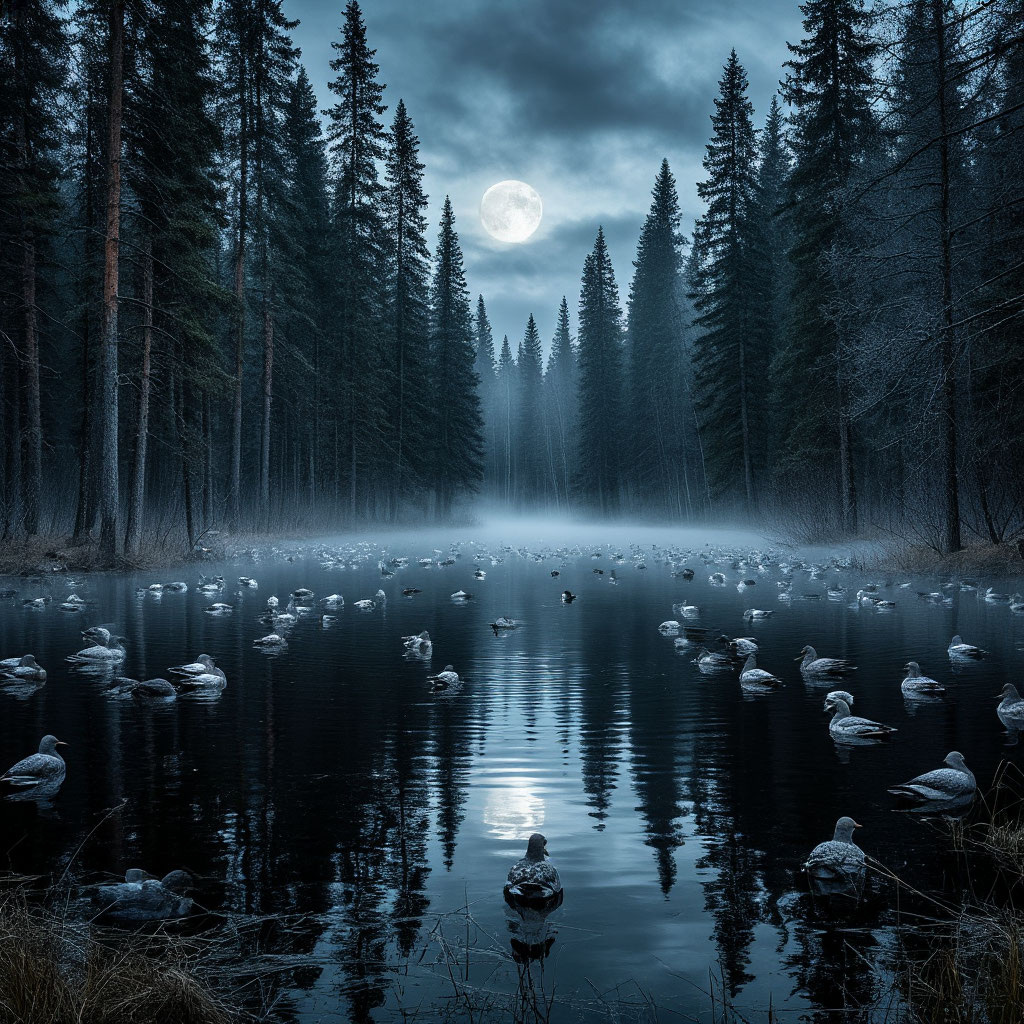 На картах этого озера нет, хотя каждый охотник в тех местах знает, где оно. Его зовут просто — Чёрная Вода. Если идти от Тунгуски два дня на север, потом сворачивать по старой охотничьей тропе, наткнёшься на него. Озеро небольшое, как блюдце, но тёмное, будто смола. И вот что рассказывают. В 2002-м туда пошли двое рыбаков из Эвенкии — братья Сопровы. Говорили, что там «зверьё не боится» и рыба — крупная, редкая. Они ушли в июле, обещали вернуться через неделю. Не вернулись. Поиски шли долго. Осенью нашли лодку — вытащена на берег, сухая. Рядом — котелок, ружьё, снасти, всё аккуратно. Только людей нет. На воде в центре озера был круг — ровный, будто кто-то прожёг. И вся поверхность покрыта тонкой радужной плёнкой, как нефть, но пахло не мазутом, а металлом. На деревьях вдоль берега сидели птицы — мёртвые. Не падали, не клеванные, просто застыли, будто кто-то их остановил. У всех глаза открыты, направлены к середине озера. Лес вокруг — тихий, ветра нет. Но если прислушаться, слышно