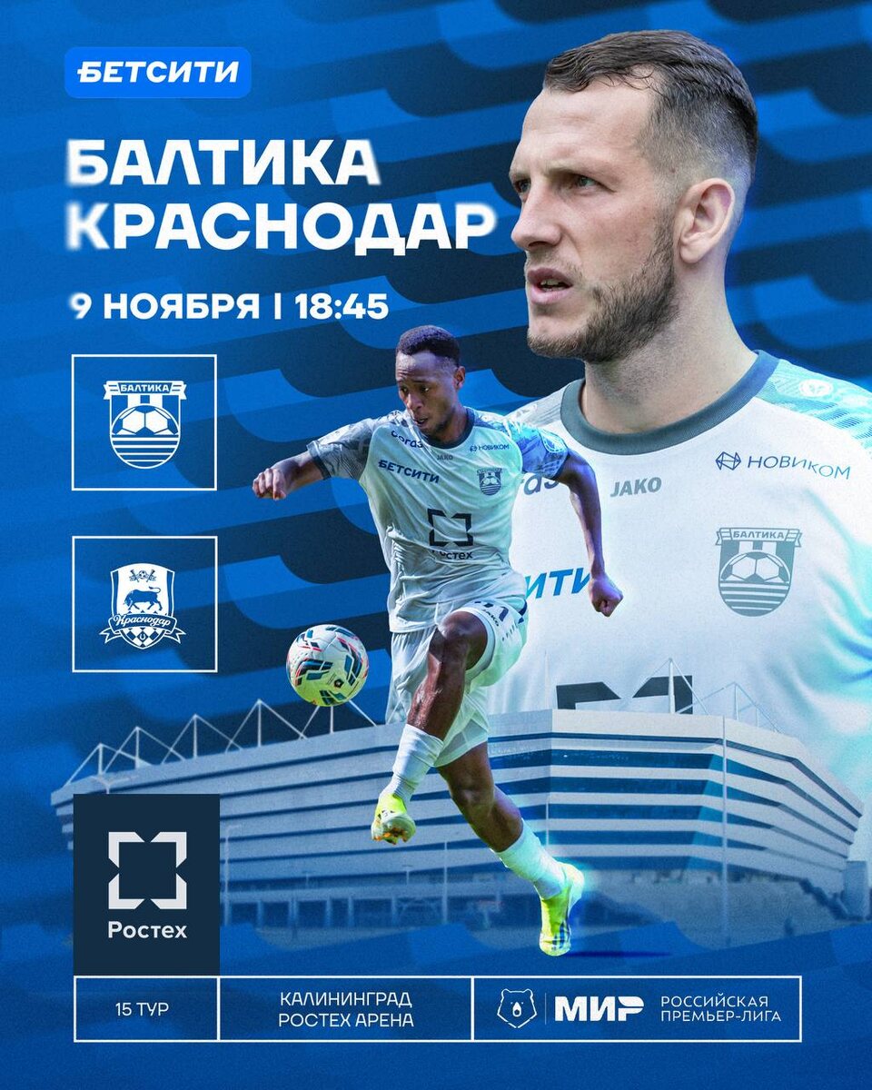 БАЛТИКА ⚔️ КРАСНОДАР В воскресенье на «Ростех Арене» ждем в гости действующего чемпиона России — ФК «Краснодар»! Команда Мурада Мусаева уверенно стартовала в сезоне. Они не сдают позиций и, как и в прошлом году, идут на первой строчке турнирной таблицы, набрав 32 очка. У «Краснодара» отличная форма — 4 победы подряд в РПЛ, так что борьба предстоит по-настоящему жаркая. 📆 9 ноября (воскресенье) ⏰ 18:45 🏟️ «Ростех Арена» 🎟️ Билеты уже в продаже Вперед, Балтийцы! 🌊 ⚠️ Для посещения матчей Мир РПЛ необходима карта болельщика.