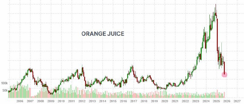 Апельсиновый сок: Эпичный обвал цен после двух лет рекордов! 📉🍊 После двух лет непрерывного роста, когда цены на апельсиновый сок достигали исторических максимумов, 2025 год принес резкое падение стоимости. В 2023–2024 годах стоимость взлетела из-за низких урожаев, а пик был достигнут в июне 2025 года, когда фьючерсы превысили $5 за фунт. Однако, к октябрю ситуация развернулась: цены рухнули в 2,5–3 раза, опустившись ниже отметки в $2 за фунт, что является минимумом с конца 2022 года. Основной причиной такого обвала стало восстановление урожая в ключевых регионах, что привело к избытку предложения на рынке. Эксперты отмечают, что только в октябре цены упали на 23,3%, что стало самым сильным падением среди всех мировых товаров. Для потребителей это означает долгожданное снижение стоимости любимого напитка после длительного периода удорожания. #новости #БезПафосаФинансы #АгроРынок