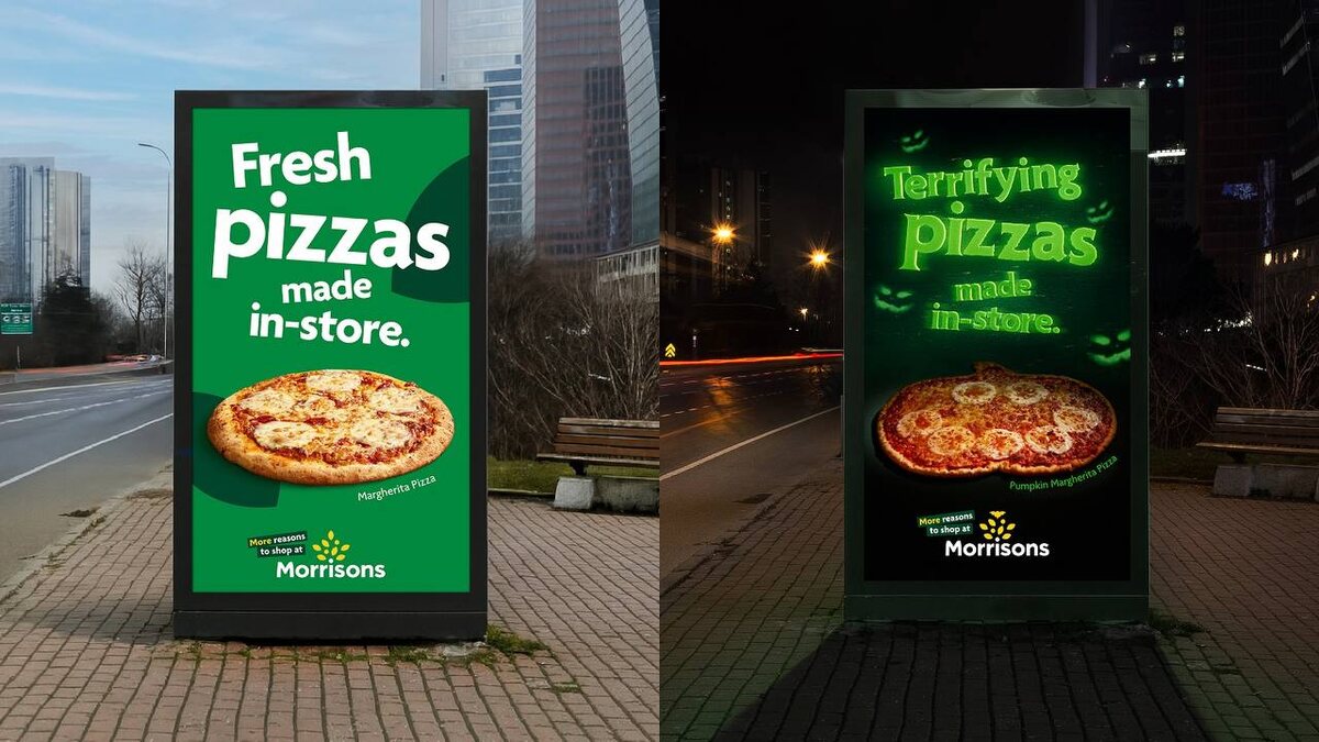 В этом году сеть британских супермаркетов Morrison's и креативное агентство Leo UK подарили Хэллоуину по-настоящему технологичное воплощение. Их кампания «After Dark Ads» — это не просто смена картинки, а преображение цифровых билбордов с наступлением темноты. 👻 В основе — светочувствительная технология. Стоит стемнеть, как статичный дневной постер с пиццей превращается в динамичную анимированную сцену с призраками, неоновым огнем и пальцами вампиров. 🎃 Ночью меняется не только картинка, но и текст. Названия и описания пицц превращаются в жуткие альтернативы вроде «вампироустойчиво» и «жутко остро», что идеально попадает в настроение праздника. 📱 Рекламная кампания в ключевых локациях усиливается глитчами и жутковатой музыкой в соцсетях, создавая единую цифровую экосистему для охвата максимальной аудитории.
