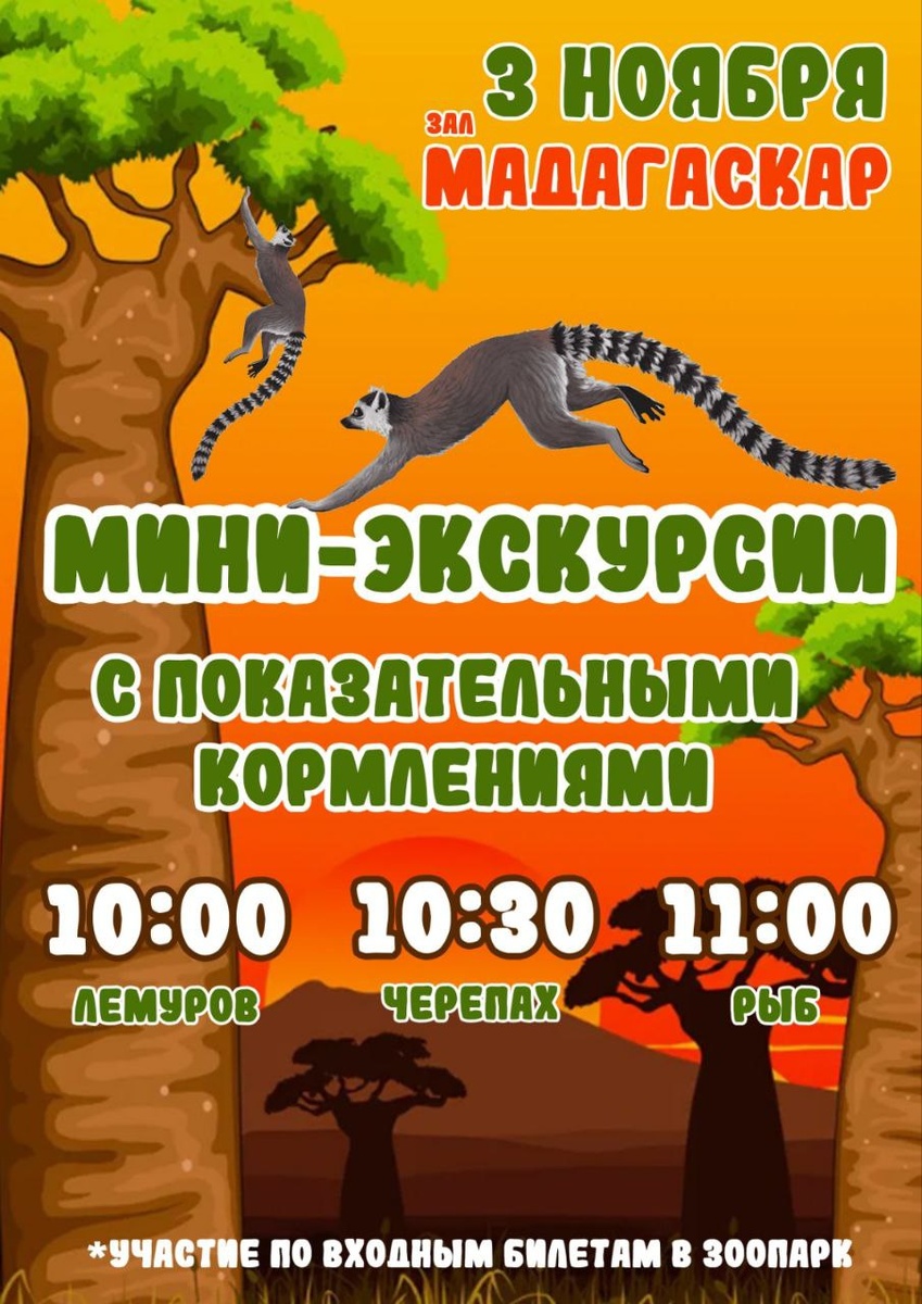 3 ноября, в Зоопарке, экспозиция «Мадагаскар» распахнет свои двери. С 10.00 до 11.00, каждые полчаса, вас ждут захватывающие мини-экскурсии, познавательные викторины с ценными призами и завораживающее показательное кормление одного из удивительных эндемиков острова. В этот день вы не только прикоснетесь к загадочному миру лемуров, черепах и диковинных рыбок, наблюдая за их трапезой, но и унесете с собой частичку Мадагаскара – памятный подарок, хранящий тепло этого уникального места. *Для участия достаточно купить билет в зоопарк. 🫠 Детские мероприятия Ростов-на-Дону. Я местный! 📱 Мероприятия Ростов-на-Дону. Я местный! в MAX