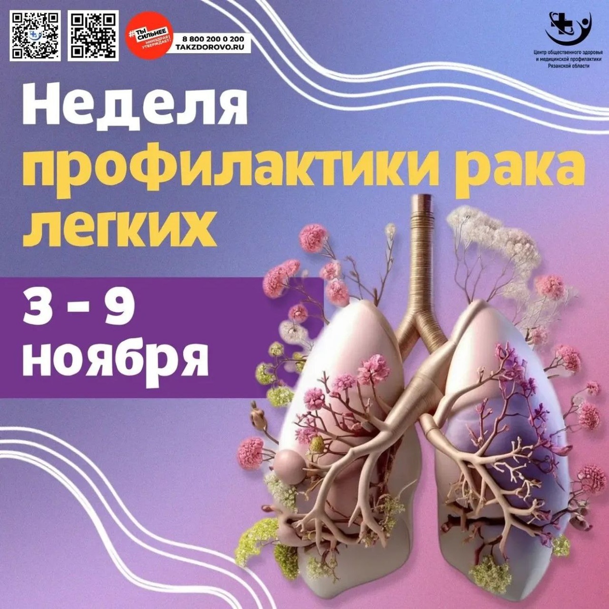 3–9 ноября — Неделя профилактики рака легких 👃 Рак лёгких — один из самых распространённых и опасных видов онкологии. Но важная новость в том, что его развитие во многом можно предотвратить! Главный фактор риска — курение. Отказ от этой привычки лучшая инвестиция в здоровье ваших легких. Что еще помогает снизить риски? ✅ Избегайте пассивного курения ✅ Проверяйте свой дом на наличие радона ✅ Соблюдайте технику безопасности при работе с вредными веществами (асбест, тяжелые металлы) ✅ Поддерживайте в доме хорошую вентиляцию Будьте внимательны к сигналам организма: длительный кашель, одышка, боль в груди, беспричинная потеря веса — повод обратиться к врачу. Измените привычки сегодня — чтобы сохранить здоровье и жизнь завтра! ❤ Пройдите профилактическое обследование, если вы в группе риска. #НеделяПрофилактикиРакаЛегких #РакЛегких #ПрофилактикаРака #ЗдоровьеЛегких #БросьКурить #здоровоебудущее #ЗдоровоеБудущее62 #ЗдороваяРязань