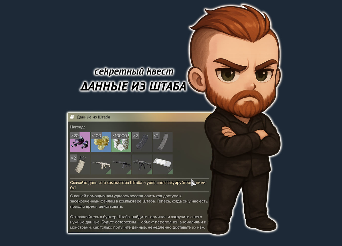 для того чтобы открыть данный квест необходимо будет побегать, сделать минимум пять рейдов на карту Штаб, выполнить один квест и потом вынести четыре флешки с кодами доступа, которые нигде никак не обозначаются. 1. начинается все с обычного квеста "найдите карту памяти на теле командира и успешно эвакуируйтесь с ней", делается в целом не сложно, необходимо проникнуть в кинотеатр и пошукать в карманах на теле командира экипажа возле разбившегося вертолета [вертолет можно лутать, он разделен на три секции и не все обращают на это внимание] 2. после выноса флешки с тела командира квест обрывается и нигде ничего не отображается, ваша задача найти еще четыре накопителя с кодами доступа в следующих локациях: - северный бункер: ныряем через парадный вход и налево, сейф у стены по правую руку - отель: второй этаж, сейф в первой комнате слева - южный бункер: падаем в двери пристройки наверху бункера, и сразу видим сейф слева от стола - диспетчерская аэропорта: прорываемся на самый верх, коды до