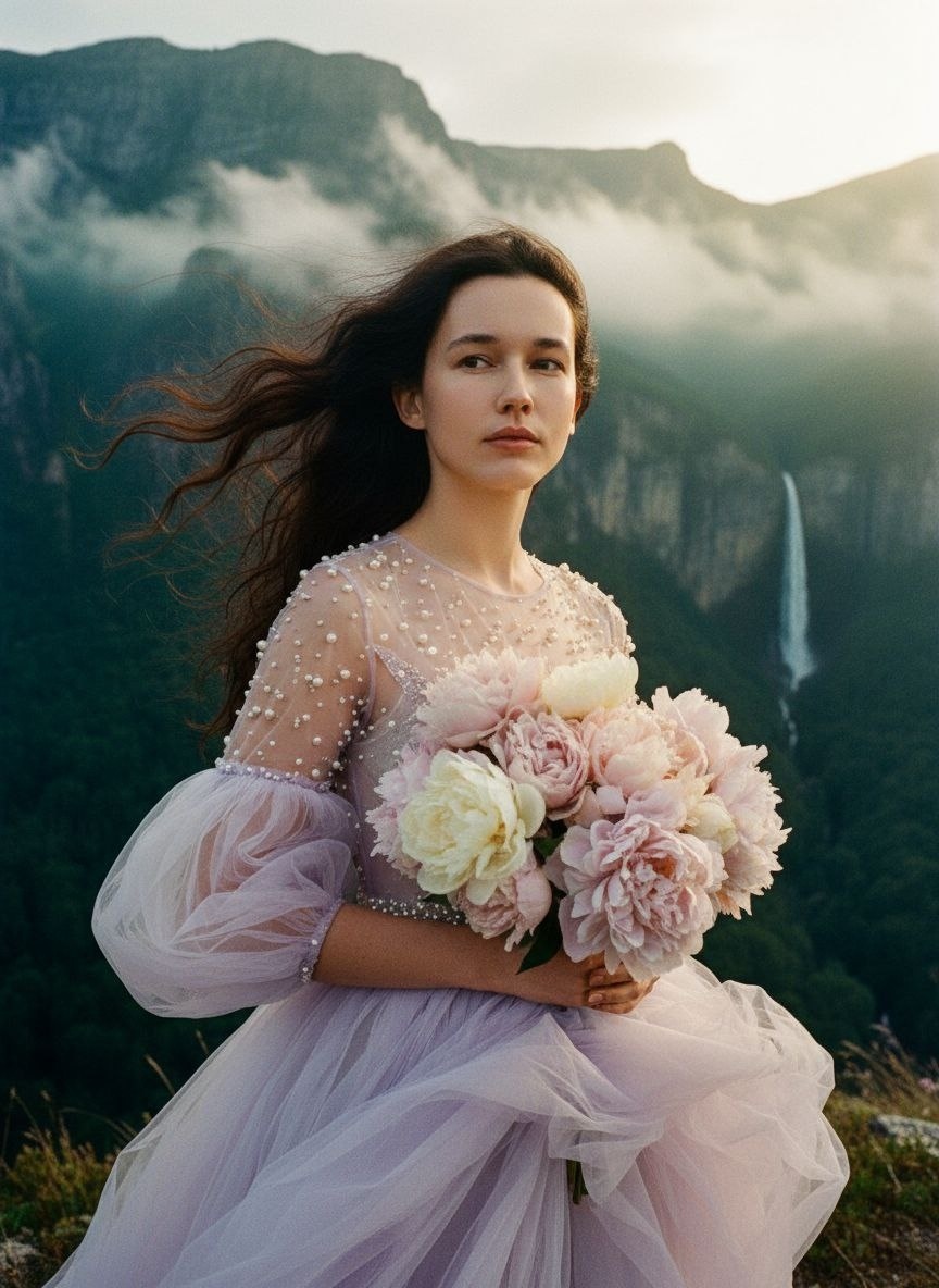 A dreamy, high-fashion portrait of a woman with wind-swept hair standing on a misty mountain ridge. Her pose is graceful and powerful, as she looks confidently into the distance. She is wearing an ethereal, light lilac gown with pearl embellishments, voluminous sleeves, and delicate textures, blending romantic and futuristic aesthetics. The waist of the dress is adorned with chiffon fabric, adding lightness and airiness. In one hand, she holds a bouquet of delicate peonies in soft pastel shades, enhancing her elegance. Th