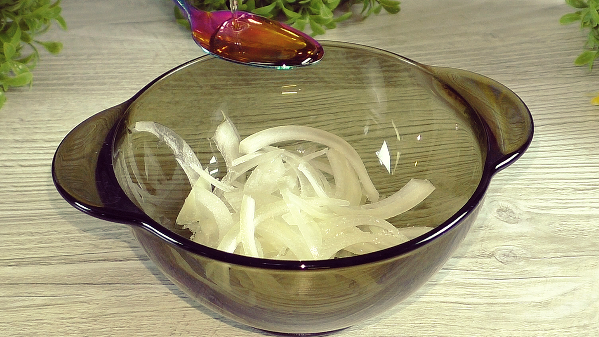 В начале приготовления нарежьте лук, добавьте в него щепотку соли и немного сахара.